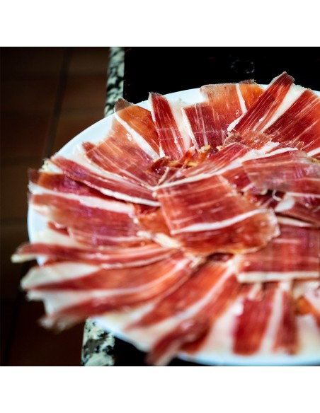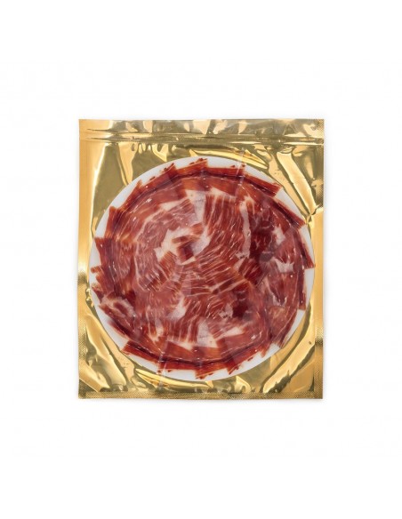 Loncheado de jamón de bellota ibérico 100% raza ibérica etiqueta negra de cerdos ibéricos han sido criados en extensivo en dehesa a base de bellota.